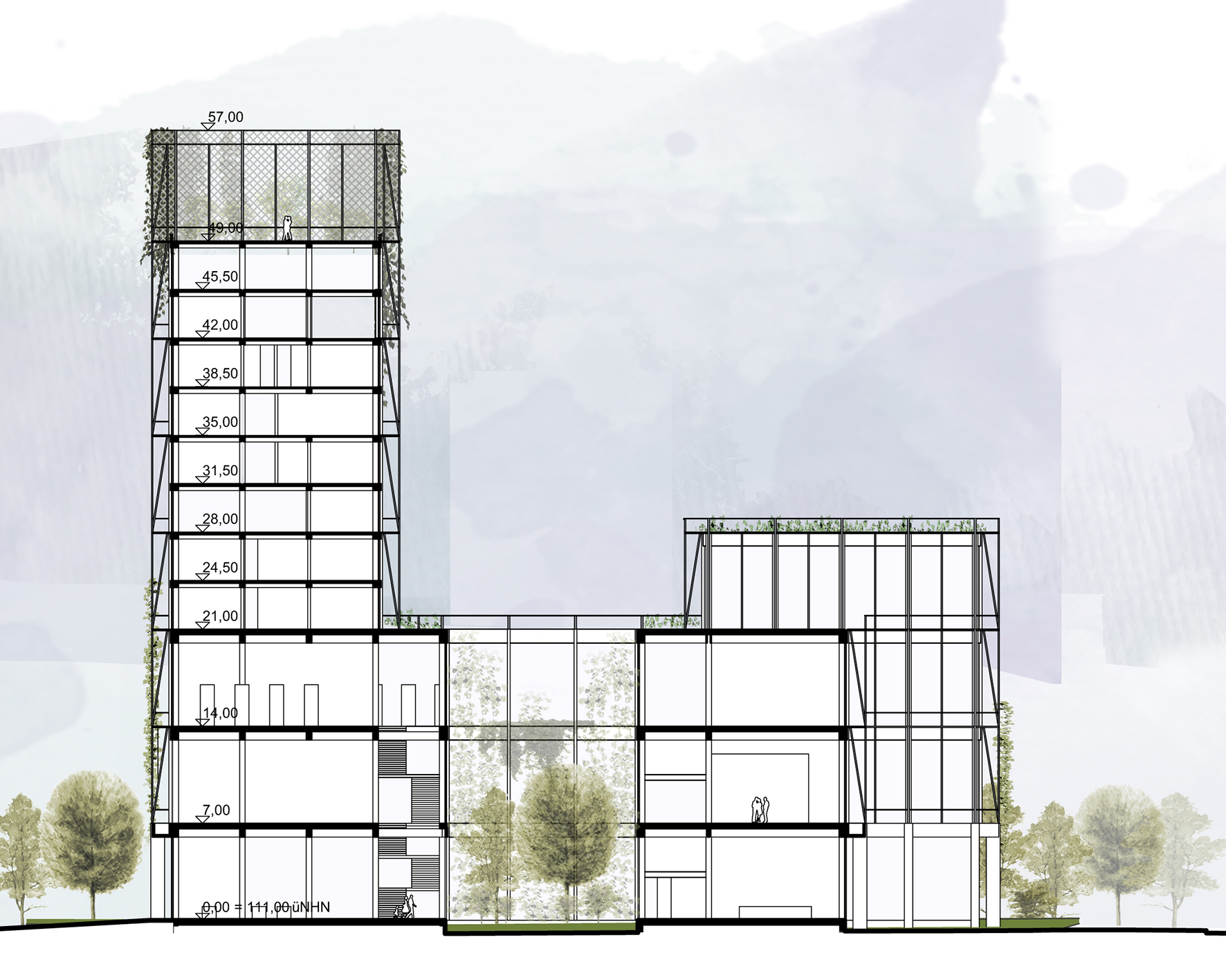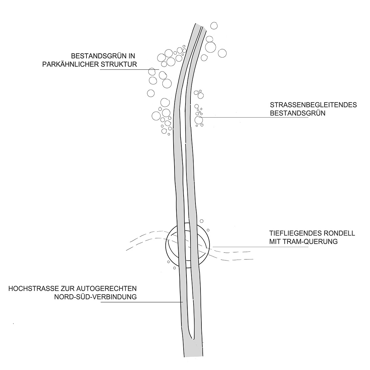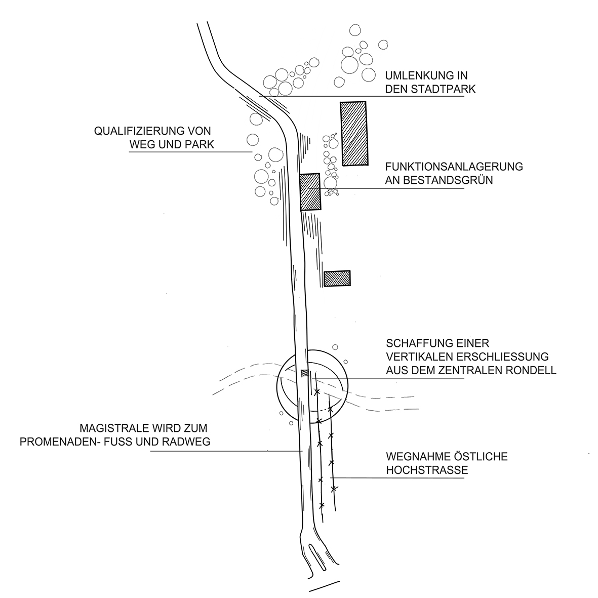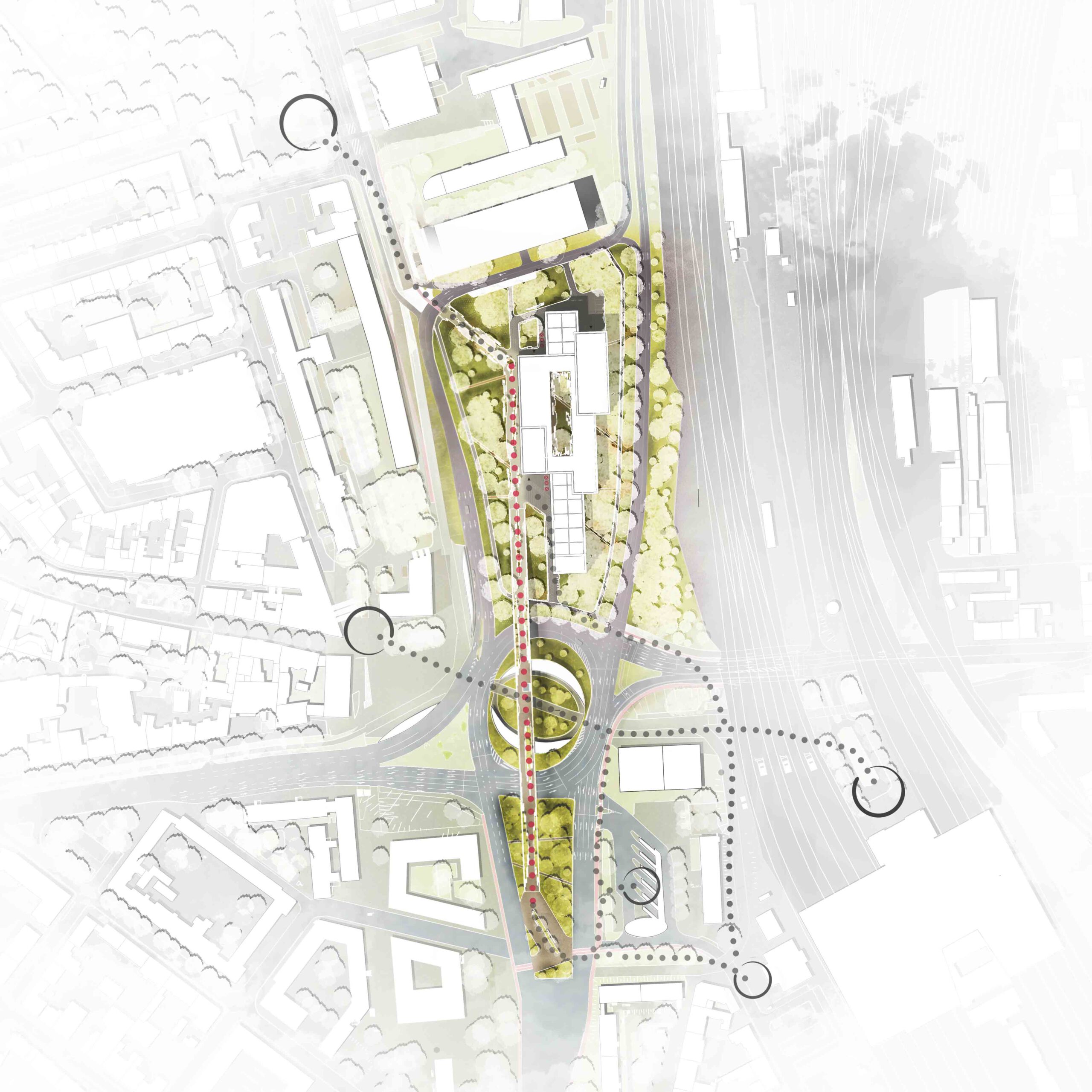 Durch das spannungsreiche Anlagern der wichtigsten Funktionen entlang vorgegebener Wege aus Hochstraße und Stadtzugängen entsteht ein Zukunftsquartier eingebettet in vorhandenes Grün. Mit Respekt dem Bestehenden gegenüber versteht sich das neu Hinzugefügte als zurückhaltendes und dennoch eigenständiges Zeichen unserer Zeit.