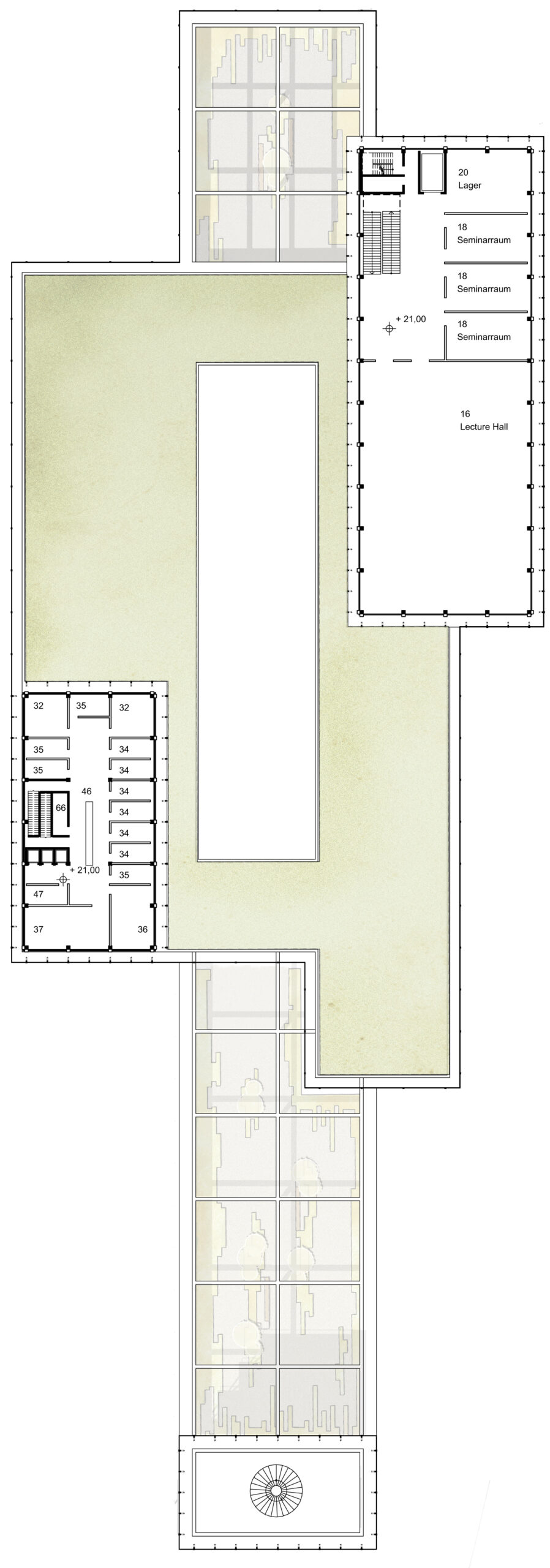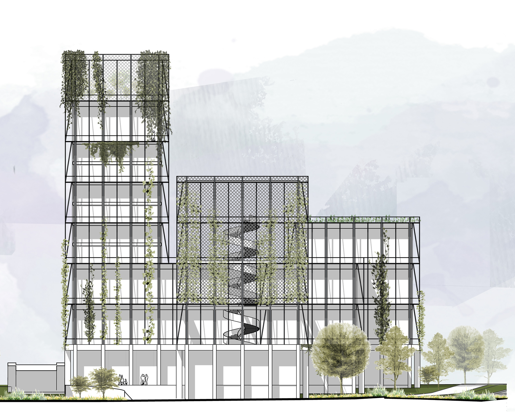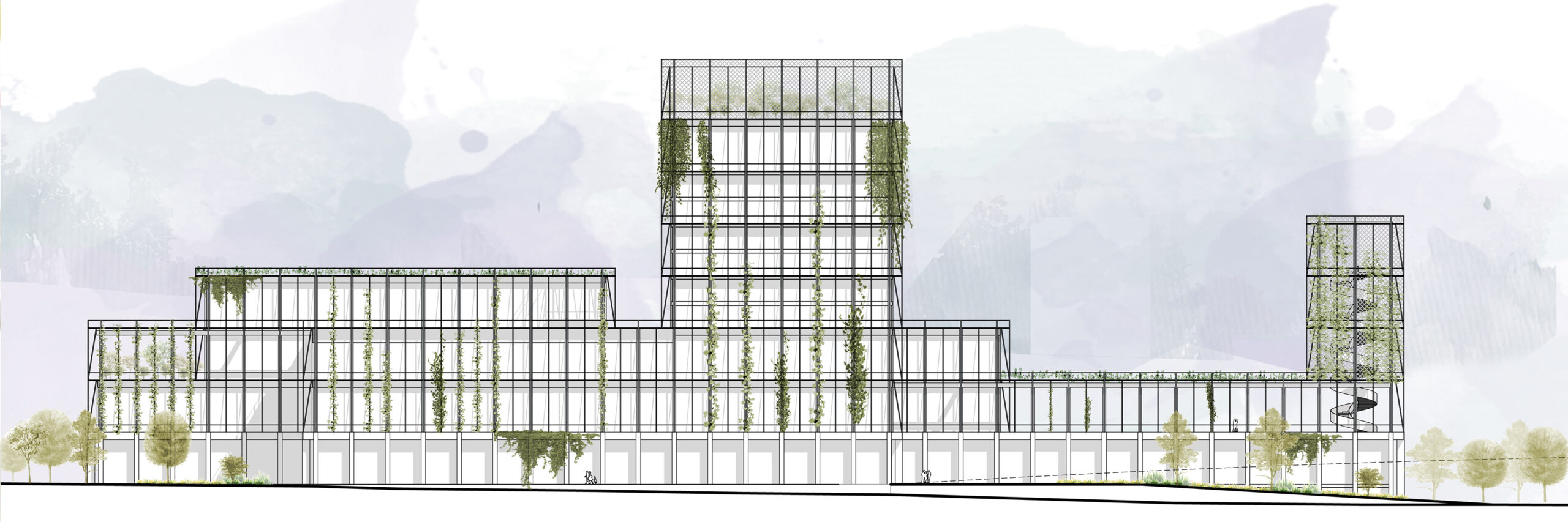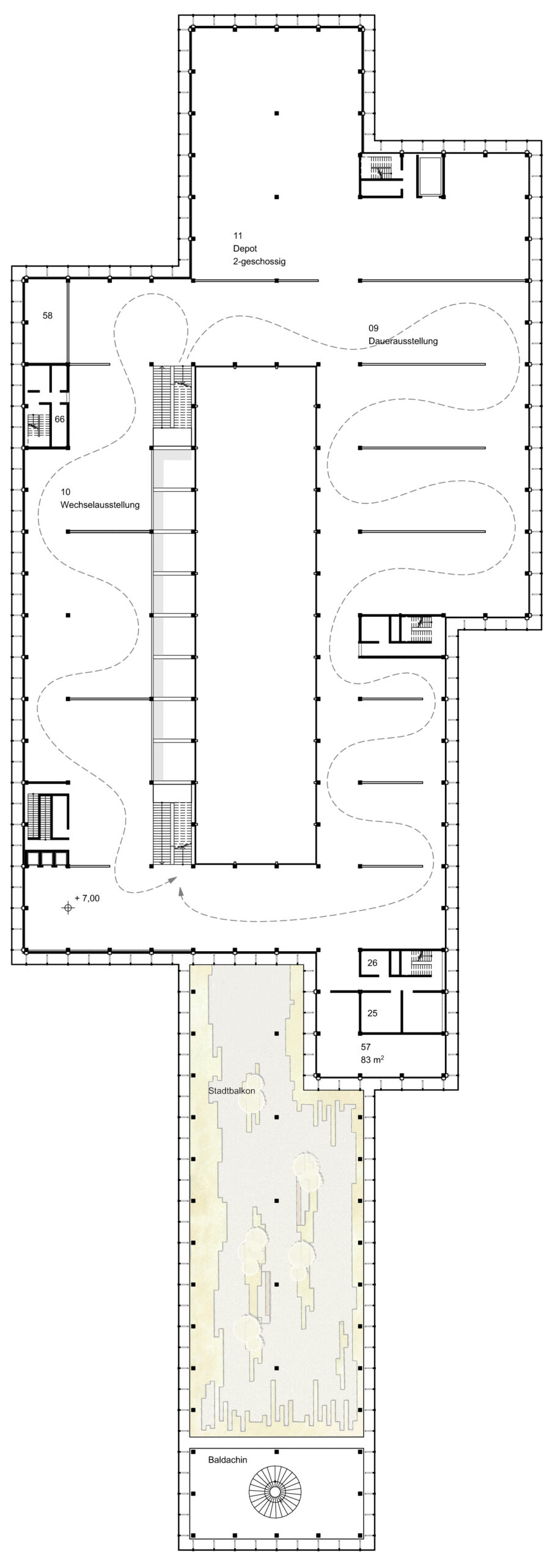 Durch das spannungsreiche Anlagern der wichtigsten Funktionen entlang vorgegebener Wege aus Hochstraße und Stadtzugängen entsteht ein Zukunftsquartier eingebettet in vorhandenes Grün. Mit Respekt dem Bestehenden gegenüber versteht sich das neu Hinzugefügte als zurückhaltendes und dennoch eigenständiges Zeichen unserer Zeit.