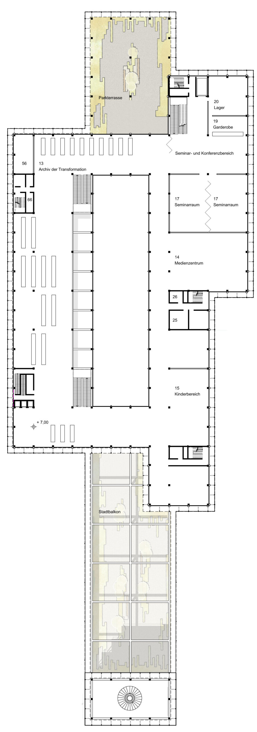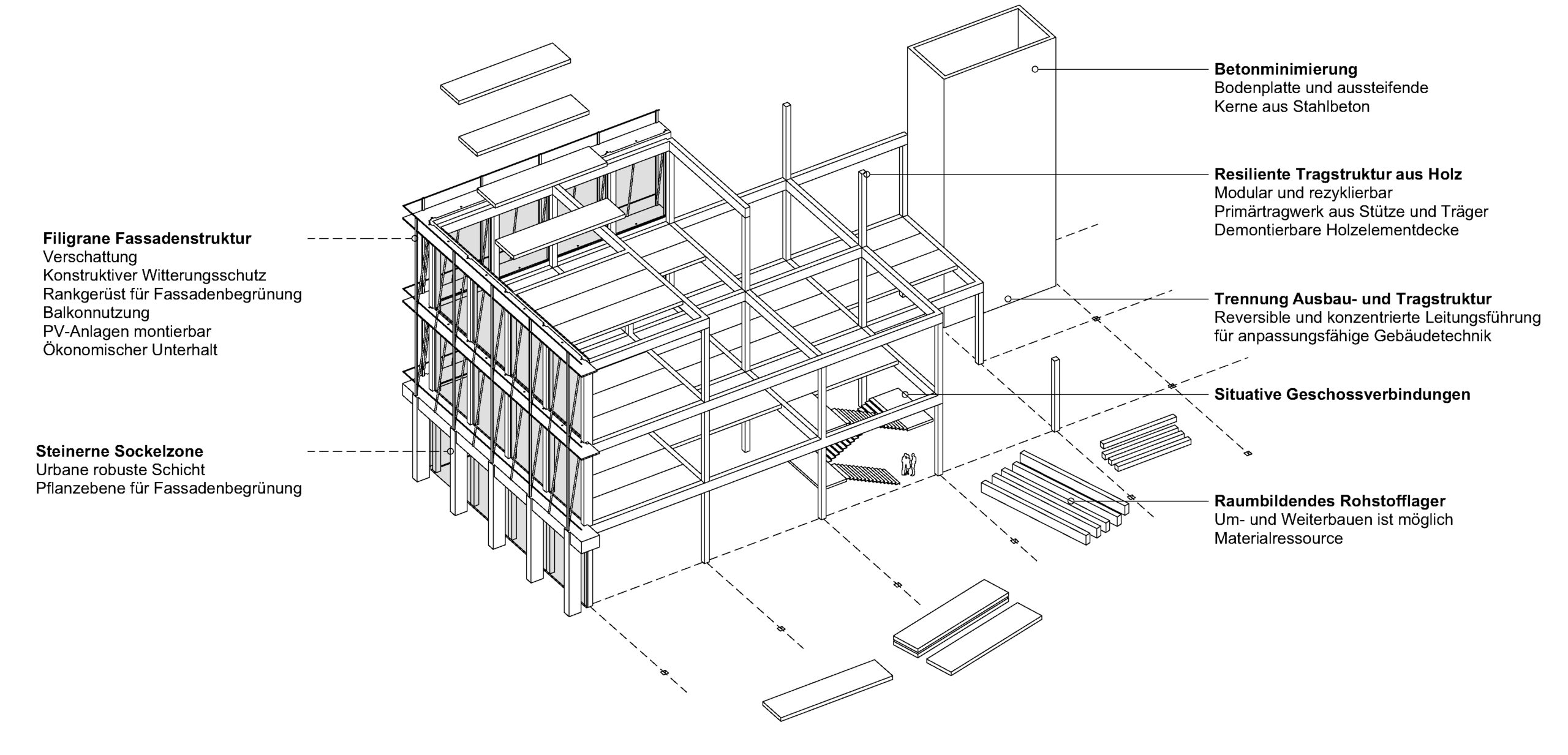 Dabei wird die Prozesshaftigkeit zur gestalterischen Haltung. Der transformatorische Gedanke beginnt schon bei der Konstruktion und öffnet damit den Blick auf eine spätere Umnutzung. So entsteht kein Bauwerk für Jahrhunderte sondern ein raumbildendes Rohstofflager, welches zukünftige Generationen als resiliente Struktur zum Um- und Weiterbauen anregen soll oder bei Bedarf als Materialressource für neue Ideen zur Verfügung steht.